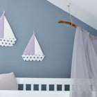 De zeilboten zijn tussen de 36 en 42 cm hoog, zijn aan de buitenkant gemaakt van 100% katoen en zijn machinewasbaar. Om ervoor te zorgen dat ze stabiel en stevig aan de muur hangen, zijn ze aan de binnenkant extra versterkt met licht vlies. Inhoud: 2 zeilboten.