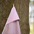 De handdoek met capuchon heeft een afmeting van 75x75cm en is rondom afgewerkt met bijpassend biaisband. De capuchon is gemaakt van katoenen stof uit onze collectie.